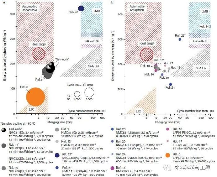 圖1.快充電池的優(yōu)勢圖。綜述了有關(guān)充電比能量隨充電時(shí)間變化的文獻(xiàn)研究,在給定的充電條件下,以氣泡大小表示循環(huán)壽命。a,循環(huán)數(shù)大于800的電池。b,循環(huán)數(shù)小于800的電池。