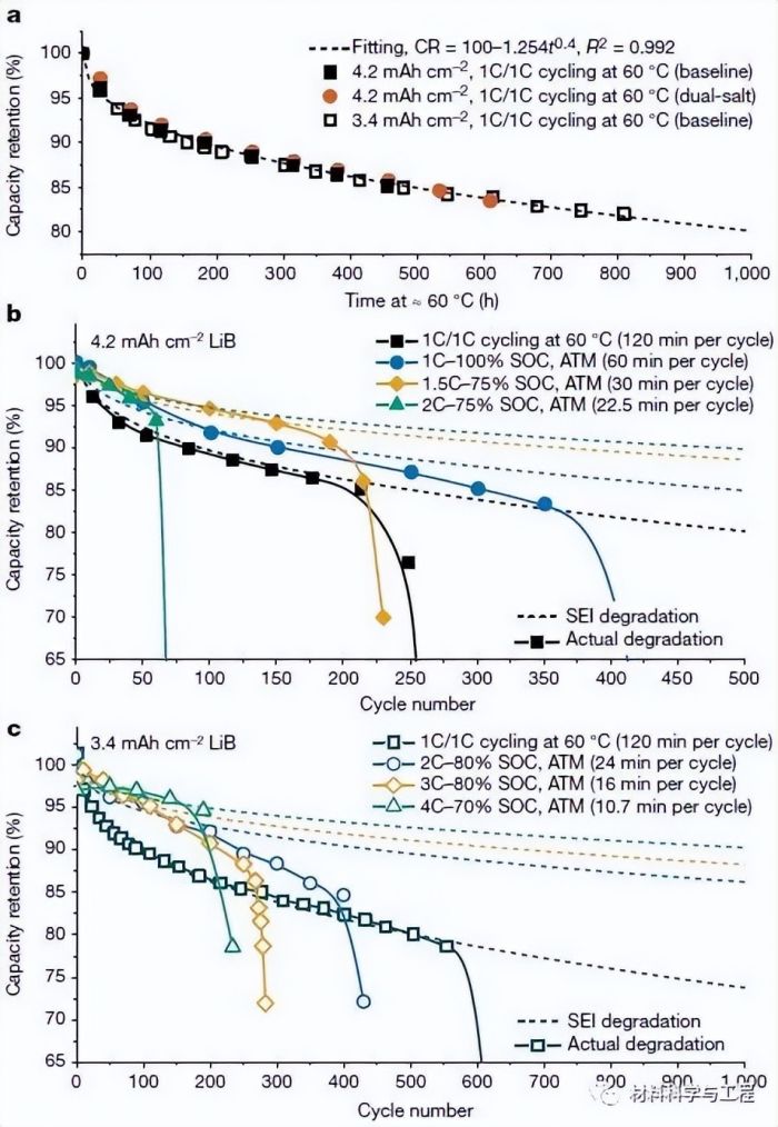 圖2.高能鋰離子電池的ATM循環(huán)。a,在60°C恒定1C/1C循環(huán)來表征SEI降解。b,4.2 mAh cm?2電池的ATM快充。c,3.4 mAh cm?2電池的ATM快充。b和c中的實(shí)線表示實(shí)際的電池容量損失,而虛線表示SEI造成的容量損失。