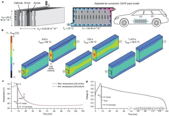 圖4.150Ah棱鏡電池12S1P包的電化學(xué)-熱耦合模擬。a,電池結(jié)構(gòu)、組件模型和吸氣空氣對流下的熱條件。b,在4C充電-C/3放電循環(huán)過程中,150 Ah棱柱電池在三個代表性時(shí)間的瞬間三維溫差輪廓。c,棱柱電池內(nèi)最高和最低溫度的演化。d,循環(huán)過程中電池電壓的變化。